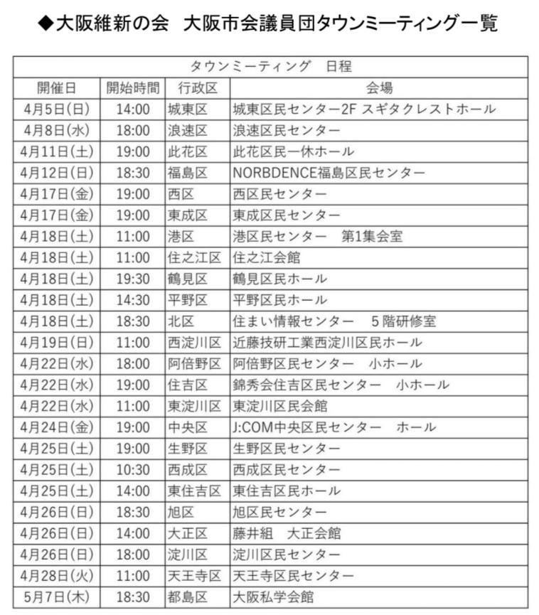 大阪維新の会 市会議員団主催のタウンミーティング。都合のつく会場にぜひ出席されて、「都構想住民投票は要らない!市民の生活窮状救うまともな施策を!」と要求しましょう。