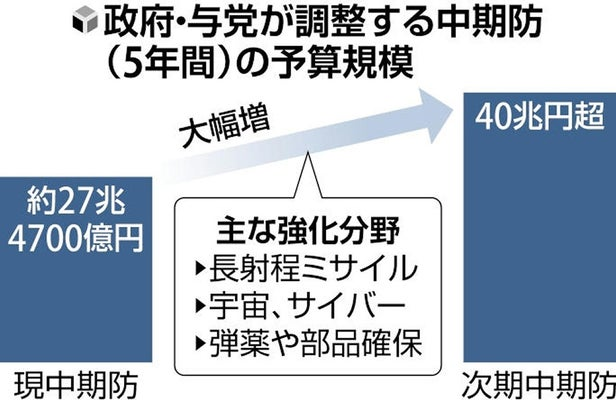 「中期防」=「中期防衛力整備計画」5年ごとに見直す。2023年より名称を「防衛力整備計画」と変更。